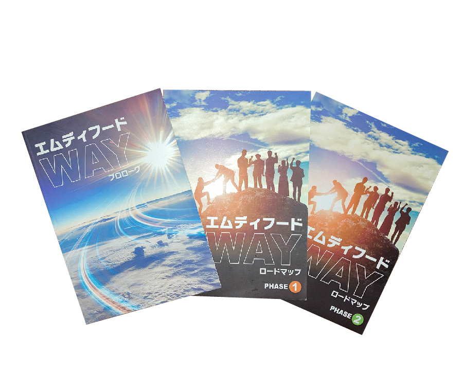 3冊1組のエムディフードWAYは1人1組ずつ入社時に配布されます。書き込み式のテキストで、自身が学んだ内容と、育成担当者からのコメント記入もされていきます。個人の成長が記録・可視化されることで、時に自身を俯瞰し、ともに歩むアイテムとなります。