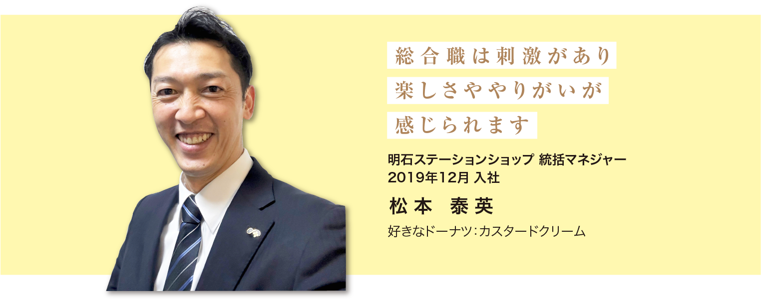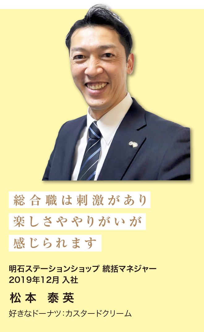 エムディフード入社前もミスタードーナツを運営している他社で店主をしていたのですが、前社よりも良い採用条件だったので入社を決めました。休日や手当などもしっかりしていて、昇格や昇給の制度もあり、自身の未来への期待が感じられる会社でした。実際、私は中途採用でしたが2年で統括マネジャーを任され店舗マネジメントのみならず色々な仕事をさせていただいてます。