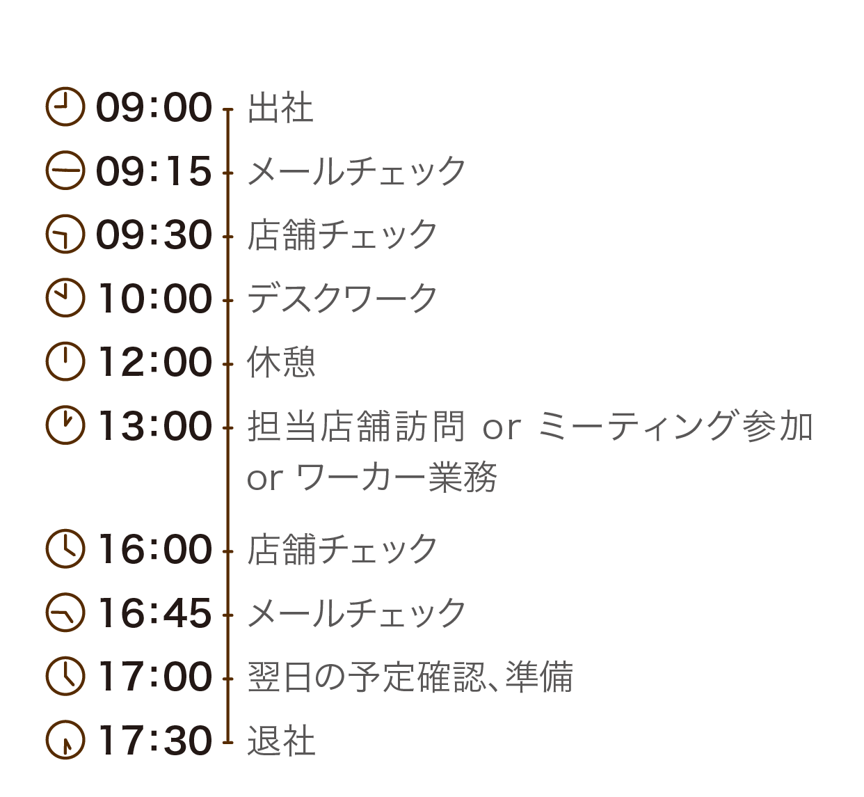 1店舗の店主と他3店舗を合わせたエリアのマネジャーをしています。自分が在籍しているショップの責任者業務は勿論ですが、担当ショップへの訪問や指導、エリア内の取りまとめ業務、会議・ミーティングなど仕事はさまざまです。ショップの店主と本社や関連会社の連携役も担っています。ワーカー業務よりもマネジメント業務が多くを占めています。遠い担当店舗には数日間出張しての訪問もあります。新入社員への業務指導もしています。